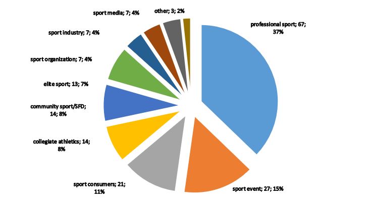 SM researchers were brought together by shared concerns. As stated in the mission of the North American Society for Sport Management (NASSM), ‘…members of the Society are concerned about the theoretical and applied aspects of management theory and practice specifically related to sport, exercise, dance, and play, as these fields are pursued by all sectors of the population’ (NASSM, n.d.). Sport, an integral part of people’s lives, is staged and played in various forms ranging from professional sport, collegiate sport, and the numerous types of sport events to community sports and sport for development (SFD) programmes. Some of these are consumed via various media outlets. As such, the value of sport in society is co-constructed by its product or service providers (e.g. sport organisations and broadcasters) and consumers (e.g. participants and spectators). There are also stakeholders (e.g. sponsors and betting operators) that leverage sport to achieve their own organisational objectives while advancing the sport industry. We categorise these various sport offerings (i.e. products and services) and related stakeholders as domains of the SM study context that give rise to SM knowledge production. As in the previous SMD issue, this heuristic categorisation yielded 10 sport domains in the current study. As shown in Figure 1, professional sport accounted for the largest share (37%) of the 180 empirical articles examined, followed by sport events (15%), and sport consumers (12%).