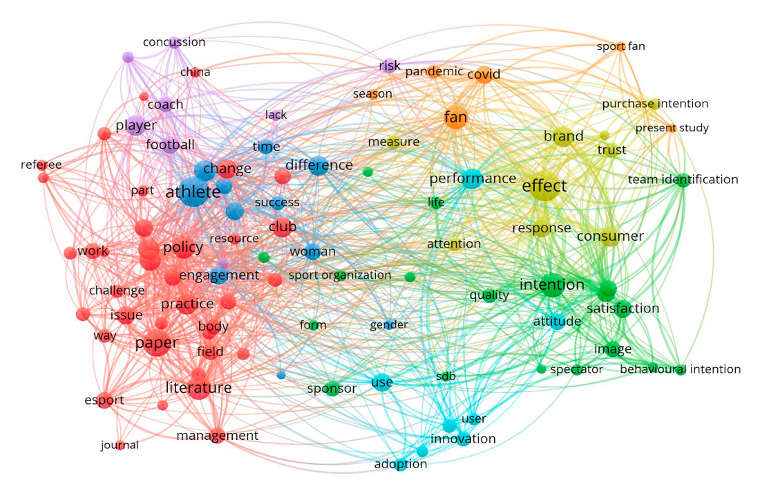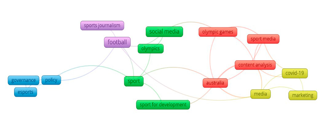 Figure 2 shows the co-occurrence links, where out of 1036 key words, 17 met the threshold of occurring more than 5 times. The size of the word indicates its weight. Figure 2 also helps to see the distance between two words where the higher the distance the lesser the connectedness. For example, the word ‘football’ dominated in the research published, followed by ‘social media’. In the same analysis of the SMD issue 1 (2), the word ‘football’ was closely related to ‘organisations’ and ‘governance’, but this time it was related to ‘sport journalism’.